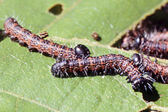 幼虫は5~6月に集団で葉を食べる。幼虫は刺激を与えると頭部を反らす習性がある。